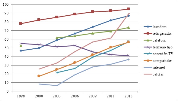 Sobre la evolución de la incorporación de artefactos tecnológicos en los hogares en el período observemos que todos los artefactos, excepto el teléfono fijo, aumentaron su penetración en el país. La tendencia que siguió Internet, el teléfono celular, el computador y el teléfono fijo. La línea que representa a Internet en el gráfico (de color celeste) se movió desde 8,55% en el año 2000 a 36,7% (2013). El teléfono celular (línea color lila) pasó de 25,5% (2000) a 89,3% (2013). El computador (línea de color café claro) era de 17,5% (2000) y 56,7% (2013) y el teléfono fijo (línea morada) disminuyó desde un 55% al 40,9%. La conexión a tv evolucionó de 21,4% (2003) a 57% (2013). Por otra parte, las variaciones del período del grupo de artefactos domésticos que componen la lavadora, el refrigerador y el calefont. Advertimos que, entre 1998 y 2013, los porcentajes de las lavadoras variaron desde 46,6% a 87%; el refrigerador pasó de 78% a 94,6% y el calefont de 53% a 73,6%; estos artefactos llegaron a estar presentes en la mayoría de los hogares chilenos.