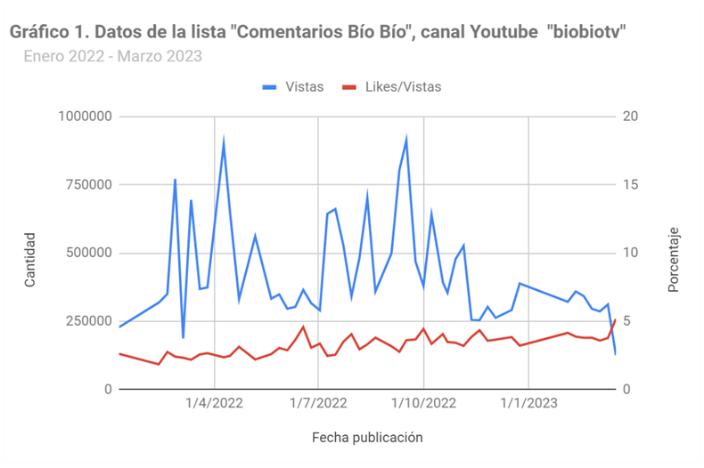 La generación de big data que hacen las personas se ilustra con un ejemplo simple. El gráfico 1 muestra los datos asociados a los videos de la lista Comentarios Bío Bío del canal de Youtube biobiotv. La serie consta de 50 videos sobre la actualidad política chilena publicados semanalmente en la plataforma en el período que comprende desde el 17/01/2022 al 18/03/2023. Los datos disponibles del video en Youtube corresponden a la cantidad de vistas, likes y comentarios y réplicas (respuestas a un comentario). Además, registra el contenido de los comentarios. El gráfico presenta las vistas de los videos (valores del eje vertical izquierdo) y la razón likes por vista (valores del eje vertical derecho). Los videos tienen un promedio de 427.000 vistas y, aproximadamente, por cada 100 vistas hay 3 likes. Las cifras totales de vistas, likes y comentarios son 21.182.683, 666.029 y 109.713 respectivamente. Las vistas equivalen a 4.900 días de reproducción.