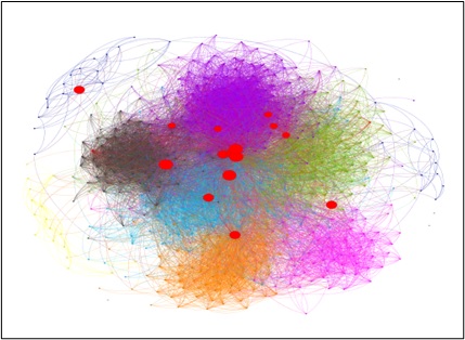 En la imagen he querido representar dos hechos relevantes en este tipo de redes. En primer lugar, que las redes están constituidas por comunidades (conjunto de nodos que son “amigos” entre ellos) y coloreadas en el grafo. En segundo lugar, hay un conjunto de nodos que juegan un papel importante en el funcionamiento de la red, son los nodos de color rojo en la imagen. Respecto a las comunidades en la red se detalla que las de color morado, verde, celeste y negro están relacionadas con los amigos de la facultad universitaria. Específicamente, con una actividad importante de facultad, con los compañeros de carrera y de otras especialidades, más los amigos de facultad en general, respectivamente. Las comunidades de color naranjo, fucsia, azul y amarillo conciernen a sus amigos de la educación secundaria, los ex compañeros de educación primaria, sus familiares y los amigos que hizo en un viaje de vacaciones de verano, respectivamente. En los nodos de color rojo podemos observar que, los de menor tamaño tienen una mayor centralidad de grado o cercanía (mayor cantidad de “amigos”). Los nodos de tamaño medio son los nodos de mayor centralidad de intermediación (puentes entre comunidades) y los de mayor tamaño corresponden a los nodos importantes en ambas centralidades. Se aprecia que los nodos de mayor intermediación (tamaño medio) están ubicados, mayoritariamente, lejos del centro del grafo y los de mayor centralidad de grado se encuentran en la parte central del grafo. Los nodos de alta centralidad de intermediación que han sido destacados corresponden a personas, no a grupos o agrupaciones, y conectan comunidades alejadas.