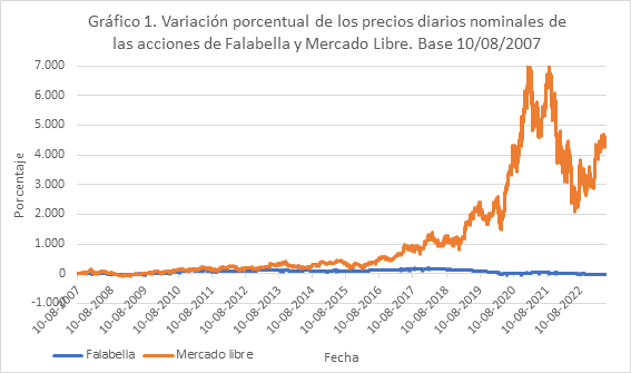 Para observar lo que ha significado el cambio de, o entre, la optimización versus innovación revisamos la trayectoria de dos empresas importantes del retail o comercio minorista de productos en Chile y Latinoamérica. Hablamos de Falabella y Mercado Libre (MELI). Se compara la trayectoria de la variación porcentual de los precios diarios nominales de las acciones de ambas empresas entre los años 2007-2023. El Gráfico 1 muestra las series de datos. Estas series son solamente ilustrativas porque usan valores nominales, es decir, no se consideró el ajuste por inflación. En todo caso el ajuste por inflación hace más pronunciada la diferencia existente.