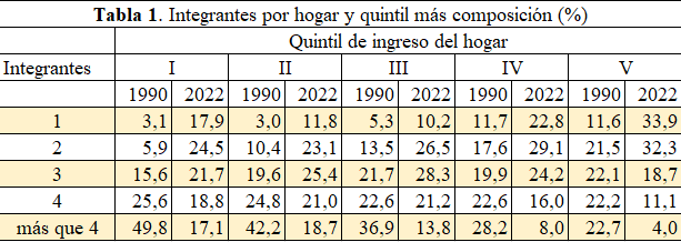 La Tabla 1 contiene el porcentaje de hogares según el número de integrantes y el quintil de pertenencia. La vista general de la tabla de datos muestra que la participación de los hogares de uno, dos, tres, cuatro y más integrantes sigue una tendencia similar en todos los quintiles, los hogares que aumentan su participación lo hacen en todos los quintiles y los que la reducen también lo hacen en todos los quintiles. Por ejemplo, observamos que los hogares de un integrante del quintil I pasan de representar un 3,1% de participación en 1990 al 17,9% en el 2022. Igualmente, las variaciones del quintil II son de 3,0% en 1990 y 11,8% el 2022; el quintil III pasó del 5,3% en 1990 al 10,2% en el 2022, el quintil IV varió desde el 11,7% en 1990 a 22,8% en el 2022 y el quintil V pasó de 11,6% en el 1990 a 33,9% el 2022. Esto significa que la reducción en el número de integrantes del hogar nacional lo experimentaron los hogares de todos los quintiles. La pérdida de integrantes del hogar según el quintil de ingreso, en promedio, es de 1,3 integrantes en el período. Los extremos de la distribución de ingresos son los que más y menos disminuyen: 1,8 y 1,2 integrantes respectivamente. Esto último, también significa que la cantidad de integrantes de los hogares de acuerdo al quintil de ingresos al que pertenecen tiende a parecerse y la diferencia se ha reducido a la mitad en estos últimos 32 años.