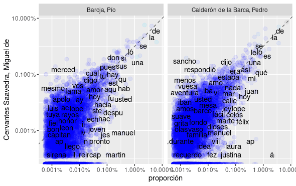 A continuación, el Gráfico 1 presenta la comparación de la frecuencia de uso de palabras de tres autores españoles: Miguel de Cervantes (1547-1616), Pedro Calderón de la Barca (1600-1681), Pío Baroja (1872-1956). El análisis emplea a Miguel de Cervantes como referencia (eje Y) en las dos gráficas que componen el Gráfico 1. La comparación aborda un total de 106.404 palabras que provienen de cuatro libros de Cervantes, cuatro de Calderón de la Barca y cinco de Baroja. Todos los ejemplares están disponibles en el Proyecto Gutenberg. Cada punto del gráfico corresponde a la frecuencia de ocurrencia de una misma palabra en el corpus de libros de cada escritor. Debido al amplio rango que poseen las frecuencias de palabras en los textos se utilizan escalas logarítmicas que van de 0,001% al 10 %. En el gráfico se incluye una línea segmentada para ayudar a la visualización, la que separa diagonalmente el gráfico en dos áreas iguales. Respecto al formato de las palabras, éstas se presentan en letras minúsculas y carecen de tildes.