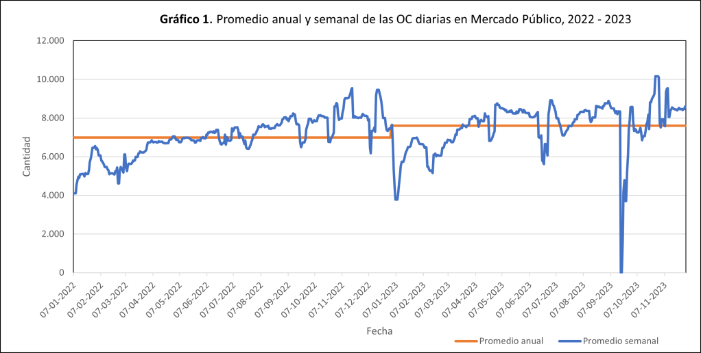 El Gráfico 1 presenta el promedio semanal y anual de las órdenes de compra generadas por el conjunto de organismos públicos (servicios de salud, gobierno central, municipalidades, universidades, gobiernos regionales y otros) que han realizado compras de bienes y servicios a los proveedores en todo el país durante el año 2022 y 2023 (enero- 30 de noviembre) a través de Mercado Público. En el eje horizontal del gráfico están los días del año y en el eje vertical la cantidad de OC en 2022, 2023. El gráfico muestra el promedio semanal (color azul) y el promedio anual (color naranja). Los promedios se calcularon tomando los días que tienen cantidades de OC superiores a 400, esto significa que se dejaron afuera los fines de semana y los días festivos principalmente.