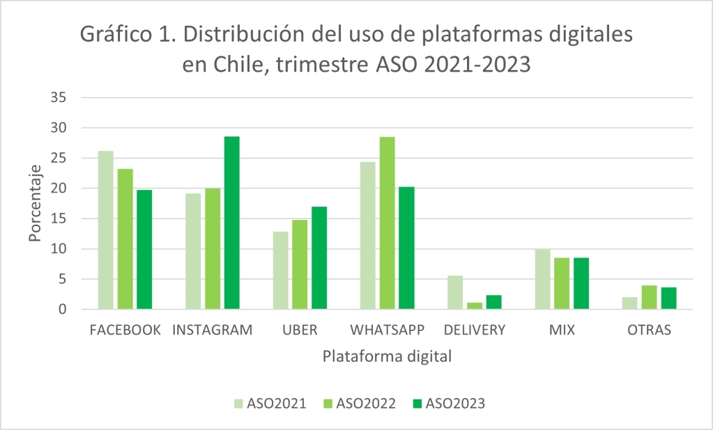 El Gráfico 1 presenta los datos del porcentaje de uso de plataformas digitales que informaron las personas a la encuesta ENE en los trimestres de Agosto, Septiembre, Octubre (ASO) de 2021, 2022, 2023. A fin de observar el comportamiento que experimenta el uso de las plataformas digitales en actividades de servicios. Específicamente, el gráfico muestra el porcentaje de uso de las principales plataformas digitales: Facebook, Instagram, WhatsApp, Uber (en adelante FIWU), en DELIVERY, MIX y OTRAS. Delivery agrupa a las aplicaciones especializadas en la entrega de productos, Mix agrupa a los ocupados que usan dos o más plataformas principales (FIWU). Otras se refieren al conjunto de plataformas usadas, pero que son distintas a las principales.
