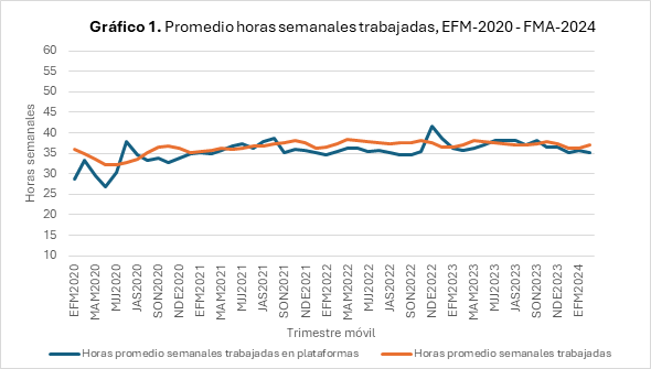Qué indica la tendencia respecto a las ocupaciones con plataformas digitales. El análisis destaca varios elementos. El primero, desde la perspectiva del promedio de horas trabajadas en la actividad principal (Gráfico 1), no hay diferencias entre las ocupaciones tradicionales y las que están soportadas en plataformas digitales. En la ocupación tradicional el promedio de horas semanales fue 37,1 horas, y en las ocupaciones con plataformas digitales promedian 35,2 horas. El segundo elemento es que las actividades con plataformas digitales tienen un mayor porcentaje de ocupados en la segunda ocupación, representan el 10% del total; y en la ocupación principal el 3%. Lo que permite levantar la hipótesis de trabajo que estas ocupaciones no son temporales.