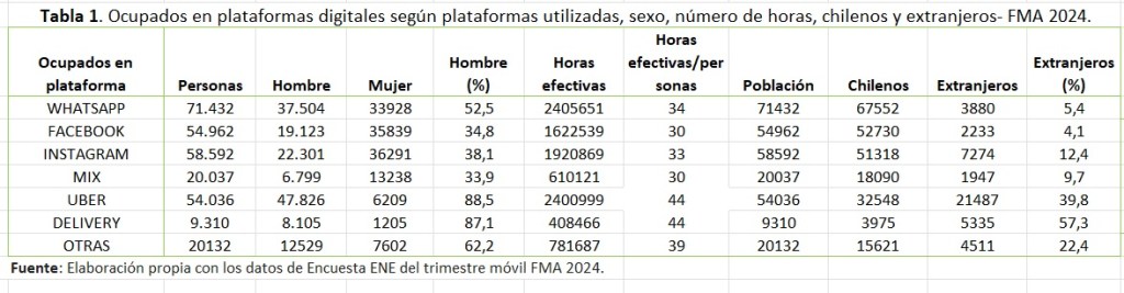 La tabla de datos resume: (1) la cantidad de horas semanales dedicadas al trabajo con plataformas digitales confirma que tales ocupaciones no se perciben como transitorias. En particular los ocupados en Uber y Delivery trabajan 44 horas semanales, la cantidad es mayor al promedio de horas dedicadas a las ocupaciones tradicionales. (2) Además, ambas plataformas son las que más ocupan los extranjeros residentes en el país. (3) Los hombres trabajan mayoritariamente, en las aplicaciones de Uber y Delivery; ambas tienen más del 85% de los ocupados. En WhatsApp la participación de hombres y mujeres en la ocupación es homogénea. En Facebook, Instagram y Mix la participación de las mujeres es mayoritaria. El grupo de plataformas agrupadas en «Otras» muestra que los hombres son más de la mitad de los ocupados.