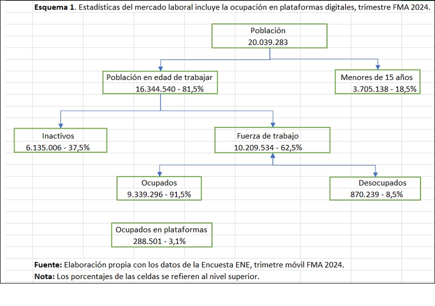 La autoridad nacional en la materia viene observando los cambios desde el primer semestre de 2020, en las estadísticas de la Encuesta Nacional de Empleo (ENE), cuando se introdujeron preguntas sobre el uso de plataformas digitales en la ocupación principal y secundaria de las personas; siguiendo las recomendaciones de la Organización Internacional del Trabajo (OIT) para el registro y medición de las relaciones de trabajo que utilizan plataformas digitales en la actividad productiva. Los datos de la encuesta ENE se refieren al mercado de trabajo nacional que identifica la fuerza de trabajo, ocupados, desocupados, inactivos mediante indicadores tales como, las tasas de participación en la fuerza de trabajo, desocupación, ocupación principalmente. El siguiente esquema presenta los principales indicadores con los datos del último trimestre móvil FMA 2024 (febrero, marzo, abril de 2024) con las cantidades y porcentajes asociados, más los ocupados que utilizan plataformas digitales.