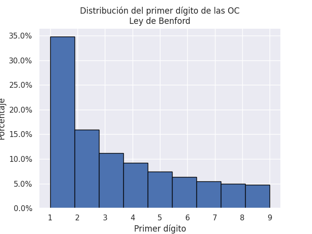 La entrada de hoy se plantea el objetivo de analizar los datos de Mercado Público de mayo de 2024 en función de los patrones indicados. Las siguientes imágenes muestran: (1) la distribución de las órdenes de compra según el monto; (2) la ley de Benford de las OC del mes; (3) la dinámica semanal de las OC durante el mes analizado.