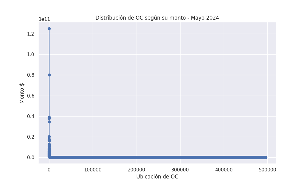 En los datos de mayo de 2024 se confirman los patrones descritos en las entradas anteriores sobre los datos de Mercado Público. Este hecho es importante porque muestra que dichos patrones forman parte de la estructuras y los procesos con que opera el Estado. Por lo tanto, deben ser considerados cuando se plantea que debe tener un papel activo como agente económico. Hemos planteado que las OC tienen una distribución de Pareto, pero si profundizamos el análisis se aprecia que la distribución es aún más extrema. Los datos del mes indican que las ciento cincuenta OC (0,081% del total de OC) de mayor monto representan casi el 50% (49,6%) del monto total. Del mismo modo las seis mil OC (3,25%) de mayor monto representan casi el 80% del monto total de OC (79,6%). Entonces, mientras en Pareto el 80% de los resultados lo genera el 20% de los agentes, en este caso el 80% del monto de las OC corresponde al 3,25% de las OC. A esto nos referimos con que la distribución de las OC es más extrema que la distribución de Pareto. Esto lo podemos medir al aplicar el Coeficiente de Gini a los montos de las órdenes de compras, su valor es 0,915, que está muy cerca de 1 que significa la desigualdad total de la distribución. Y, en este caso significa, que muy pocas OC representan una parte importante del monto total de las compras. Tengamos presente como referencia, que el Coeficiente de Gini de la distribución de los ingresos de los hogares nacionales en el año 2020 era 0,47. Un valor que es considerado muy desigual. Por lo tanto, si el Estado quiere jugar un papel más activo en mejorar la desigualdad económica debe tener en cuenta las características de sus procesos internos como el descrito.