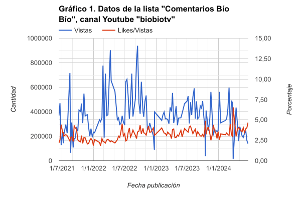 La entrada de hoy pone atención en la huella digital que dejan las personas en su interacción con el ciberespacio. Para ello se actualiza el análisis de los datos de los videos del canal BioBioChile de YouTube que se realizaron en una de las primeras entradas de este blog. Los datos corresponden a los videos de la lista «Comentarios Bío Bío«. La serie consta de 137 videos publicados semanalmente en la plataforma durante tres años (2021- 2024), desde el 13 de junio de 2021 hasta el 21 de junio de 2024. Los datos utilizados se muestran en el Gráfico 1 y corresponden a la cantidad de vistas y el porcentaje de likes respecto de las vistas. La cantidad de vistas está asociada al eje vertical izquierdo y el porcentaje de likes por vistas al eje vertical derecho. El hecho principal que se debe destacar es que las vistas tienen una alta volatilidad y que el porcentaje de likes por vistas se mueve en una estrecha banda con un punto medio de 3%. La alta variabilidad (escalabilidad de las audiencias) es una de las características que permiten las plataformas digitales. La estabilidad de los likes por vistas corresponde a un patrón (huella digital) que surge en este nuevo tipo de comunicación.
