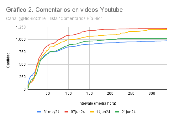 ¿Cómo podemos conocer la huella digital que dejan las personas en este tipo de plataformas? Los antecedentes muestran que las personas se han movido hacia las plataformas digitales y han interactuado en ellas. Por ejemplo, las cantidades totales de interacciones en el período son: 50.835.295 de visualizaciones, 1.601.187 de likes, y 296.172 de comentarios. Para analizar cómo es la participación de las personas en las nuevas plataformas elaboramos el Gráfico 2. En él se muestra la cantidad de comentarios que los usuarios han hecho en los últimos cuatro videos de la lista “Comentarios Bio Bio” (fecha de visualización 26 de junio de 2024). La cantidad de comentarios se calculó cada media hora desde la hora de publicación del video semanal. El gráfico contiene los primeros siete días de vida (336 medias horas) de los videos.