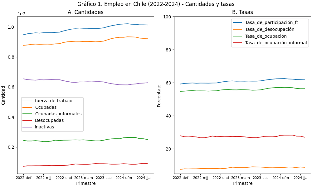 La mirada general del Gráfico 1 (A,B) muestra que el empleo en Chile se ha estabilizado, lo confirma el Gráfico 1B donde se observa que las tasas asociadas a las cantidades indicadas en el Gráfico 1A prácticamente no han variado de manera significativa, por ejemplo, el porcentaje de desocupados varió muy poco desde el inicio del año 2022, aún cuando en el primer trimestre de 2022 (DEF ) la tasa de desocupados era 7,5% y la proporción de los ocupados informales era 27,8%. Esta estabilidad suscita cierta preocupación porque el nivel está cerca del umbral de alerta, que en el empleo corresponde a un 10% de desocupación. Las variaciones en el empleo observadas en los años 2022-2024 se deben más al proceso de estabilización post pandemia que a los cambios experimentados por la economía nacional.
