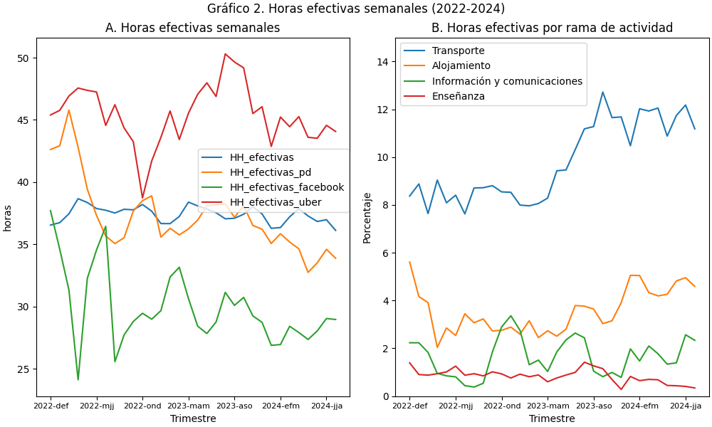 En relación a las horas efectivas trabajadas, la Encuesta Nacional de Empleo plantea que, cuantifican el tiempo que los ocupados se dedican a desempeñar actividades económicas que contribuyen a la producción de bienes y servicios durante un período de referencia corto, la semana de referencia de la encuesta. El Gráfico 2A expone las horas de trabajo efectivas semanales de los ocupados en el período, las horas efectivas en plataformas digitales y las horas dedicadas a trabajar específicamente en Facebook, Uber. En trimestre JAS 2024 el número de horas efectivas trabajadas en la semana por lo ocupados es 37 horas, 33 horas efectivas de los ocupados en plataformas digitales, y 29 horas efectivas de trabajo en Facebook y 44 horas en Uber. Según la rama de actividad económica los porcentajes muestran las actividades que tienen preponderancia (Gráfico 2B), aquí las actividades relacionadas con el transporte y almacenamiento (11,2%), los servicios de alojamiento y comidas; la información y comunicaciones y con la enseñanza. Del conjunto formado por veintiún actividades económicas que usa la encuesta ENE (Clasificador de Actividades Económicas Nacional para Encuestas Sociodemográficas, CAENES), las cuatro categorías mencionadas sobresalen del conjunto.