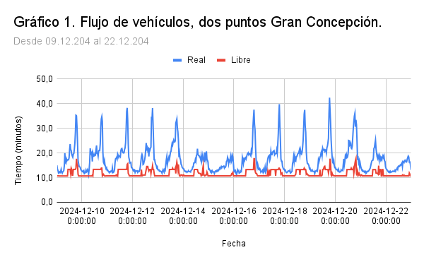 En esta ocasión interesa ver lo que sucede en particular el Gran Concepción, la zona donde vivo y trabajo. Mostrar el tiempo de viaje entre dos puntos del Gran Concepción tiene valor porque refleja las decisiones de miles de personas interactuando entre ellas al mismo tiempo. Además, técnicamente es posible hacerlo porque existen plataformas que pueden entregar la información del tiempo de viaje. En la entrada de hoy analizamos los datos de Waze, que muestreamos cada treinta minutos en el período del 9 al el 22 de diciembre de 2024. El Gráfico 1 presenta el tiempo de viaje entre los dos puntos del Gran Concepción, uno ubicado al final de Avenida Los Carrera en la comuna de Concepción, el otro a la salida de Villa San Pedro en la comuna de San Pedro de la Paz (Ruta 169, el camino que une a San Pedro de la Paz con la comuna de Coronel). La distancia de 8,1 kilómetros se midió desde Concepción hacia San Pedro de la Paz. El gráfico registra los tiempos de viaje real (Real: línea de color azul) y el tiempo del flujo libre, el tiempo de viaje sin contratiempos y por la ruta de menor tiempo real (Libre: línea de color rojo).