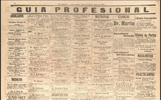 La siguiente imagen corresponde a la guía de servicios profesionales del 18 de enero de 1931 del diario La Patria de la ciudad de Concepción (Chile). Digitalizar distintas fuentes de información ha sido una de las «nuevas» actividades que permitió hacer el cambio socio tecnológico en curso, entre las fuentes están los documentos impresos históricos. Una tarea que hace muchos años se propuso llevar adelante Google para dar apoyo a un conjunto de aplicaciones que en aquel tiempo pensaba desarrollar, por ejemplo, la traducción.