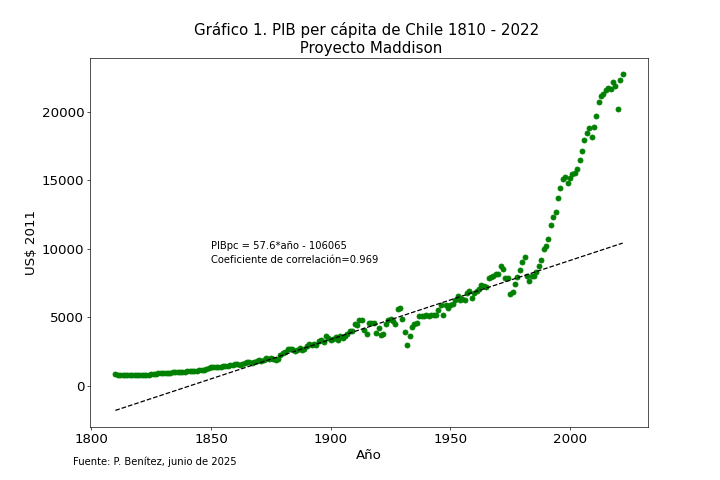 Para ver el efecto de la globalización en Chile generamos el Gráfico 1, que presenta la evolución del PIB per cápita de Chile desde 1810 hasta 2022. El proceso de crecimiento económico a lo largo de dos siglos se muestra mediante el Producto Interno Bruto per cápita (PIB pc), indicador económico que relaciona la cantidad de bienes y servicios generados por el país con la población. En el Gráfico 1 el eje vertical presenta el PIB per cápita medido en dólares del año 2011 (US$ 2011) y el eje horizontal presenta el año. Los datos utilizados proceden del Proyecto Maddison, Universidad de Groningen (Países Bajos) que reúne las estadísticas históricas de crecimiento y desarrollo económico de los países del mundo en la línea de proveer datos históricos de períodos largos (Clío dinámica). En la elaboración del Gráfico 1, específicamente se utilizaron los datos de Chile desarrollados por Díaz, Warner y Lüders del Instituto de Economía de la Pontificia Universidad Católica de Chile.