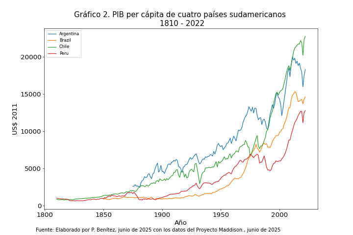 ¿Este fenómeno afectó solamente a Chile? Es una pregunta pertinente porque si fuese un hecho aislado no se podría hablar de globalización. Para entregar alguna evidencia que permita mostrar el efecto de la globalización elaboramos el Gráfico 2 que muestra la variación del PIB per cápita de cuatro países sudamericanos: Argentina, Brasil, Chile, Perú. En su elaboración también se utilizaron las series del Proyecto Maddison.