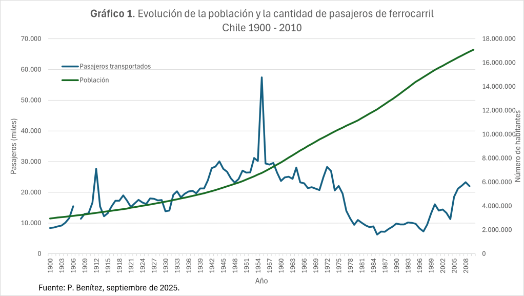 El gráfico muestra la incorporación del ferrocarril en Chile en el período señalado. Se aprecian tres etapas: la primera desde 1900 a 1960 en que la cantidad de pasajeros sigue al crecimiento de la población. Al inicio del siglo pasado la cantidad de pasajeros por año era de dos viajes por persona, y al final de la etapa se estabiliza en torno a cuatro viajes por persona. Es importante hacer notar que en esa etapa los viajes en tren no constituyeron una restricción importante para las personas, pues el aumento de la población fue seguido por el incremento de la cantidad de viajes en ferrocarril. Por ejemplo, el incremento de los viajes dio soporte a la migración de las personas a lo largo del país (podemos recordar a Carmela en su viaje desde San Rosendo a Santiago de Chile en la obra de La pérgola de las flores). Luego, entre los años 1961 y 1998 vino una etapa de decrecimiento en que los viajes por persona cayeron a uno. Finalmente en el período actual, los primeros años de este siglo, hay una leve recuperación, la cantidad de viajes por persona es alrededor de 1,3. La dinámica muestra o caracteriza los ciclos naturales de incorporación de la tecnología en una sociedad más allá de las políticas públicas que adopten los gobiernos al respecto. Las tecnologías no nacen y mueren abruptamente sino que se van combinando con las existentes y otras nuevas. En este caso, posterior a 1960 el transporte de pasajeros por buses se convirtió en un servicio masivo y el uso de vehículos motorizados particulares fue haciéndose más común. Además, en esta última etapa el renacer de ferrocarril tiene que ver sobre todo con los trenes de cercanía e inter-ciudades y con los cambios tecnológicos experimentados por los trenes, por ejemplo, los trenes impulsados por energía eléctrica.