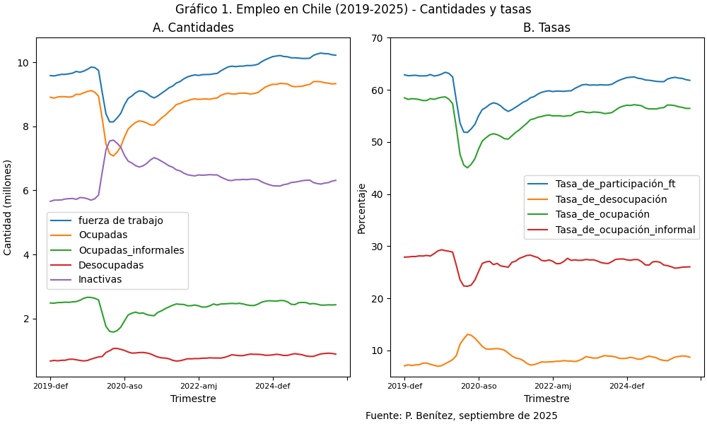 En concreto el mercado del trabajo desde el año 2022 se ha estacionado en un nivel distinto del que había antes de la pandemia. En particular la tasa de desocupación (curva naranja en Gráfico B) muestra que la desocupación del último trimestre (JJA 2025) del 8,7%, fue la misma que había un año atrás (trimestre julio-septiembre 2024), e idéntica a la del trimestre de febrero, marzo, abril 2023, aunque fue levemente inferior a la del trimestre recién pasado de 8,9% (abril-junio 2025). En otras palabras, la tendencia de los datos muestra que el porcentaje de desocupación está estacionado alrededor del 8,7%, valor un 1% superior al porcentaje anterior a la pandemia. Es fuente de la polémica el nivel alcanzado por la tasa de desocupación nacional y el tiempo de duración que se ha mantenido estancado en la post pandemia.