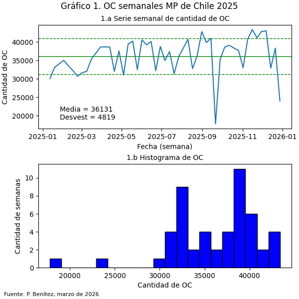 Los datos anuales de 2025 presentan patrones similares a los descritos en los años anteriores (2023, 2024), aunque con ligeras diferencias en el comportamiento normal de la generación de OC. El histograma 1.b muestra que a nivel semanal las OC no se distribuyen normalmente en torno a la media, esto es se observan dos «puntos de operación», uno en torno a treinta y dos mil OC y el otro en treinta y nueve mil OC. Esta situación expresa la dinámica anual de los organismos compradores, la que funciona en el primer semestre en un punto de operación inferior a la del segundo semestre. Y puede ser entendida como característica del desarrollo de las actividades laborales y escolares de inicio del año y de las vacaciones de verano, tal como se advierte en la curva del Gráfico 1.a. En la serie anual de datos la mayoría de promedios semanales de OC están entre la media y los límites inferior y superior, salvo algunas excepciones. Es el caso evidente de los días feriados de 18 y 19 de septiembre, correspondientes a jueves y viernes, una semana en que la generación de OC se redujo a menos de veinte mil.