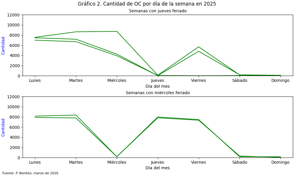 El siguiente gráfico muestra la cantidad de OC generadas en el 2025 por día de la semana. El gráfico ilustra el patrón temporal de creación de las OC de la organización destacando su comportamiento cuando enfrenta días feriados, un feriado es un día no laboral. El Gráfico 2 presenta las semanas de 2025 que tuvieron jueves y miércoles feriados, no se incluyeron los martes porque el año pasado no hubo feriados ese día. El análisis distingue dos situaciones: cuando la semana tiene «feriados puente» (martes y jueves) y cuando no tiene. Se le denomina «día puente» porque permite conectar el feriado con otros días de la semana, su efecto se observa claramente cuando éste empalma con el fin de semana anterior o posterior al feriado.